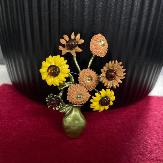 Dainty sunflower flower vase gold pin brooch