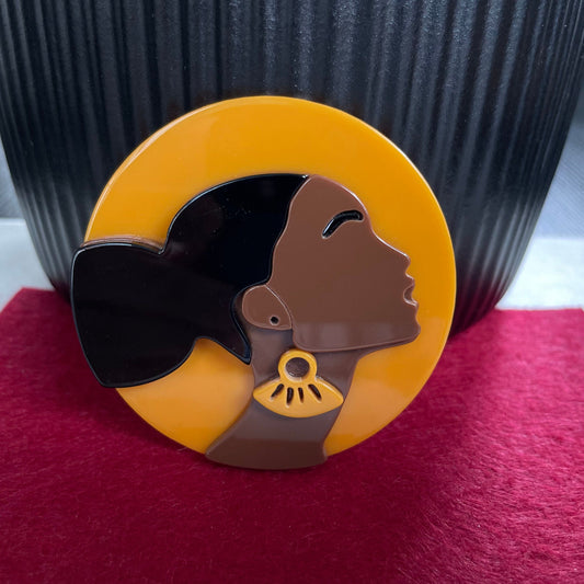 Art Deco African lady orange acrylic pin brooch