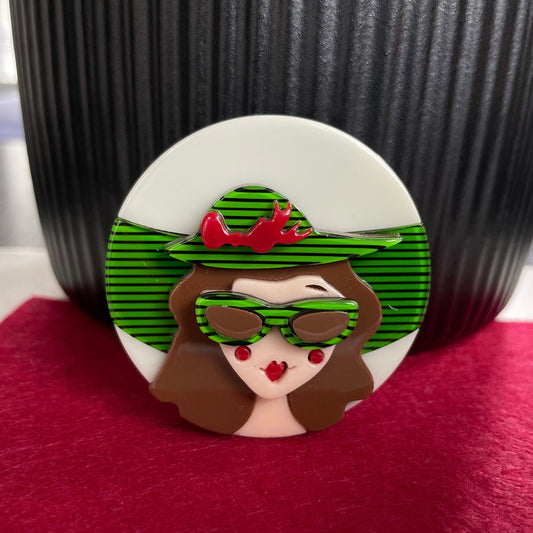 Art Deco lady with green hat acrylic pin brooch