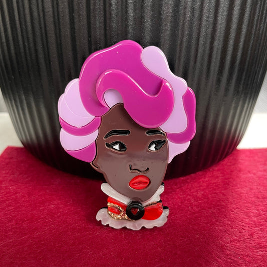 Art Deco African lady purple hair acrylic pin brooch