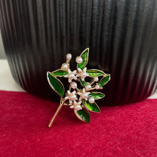 Delicate white flower pearls tree branch gold pin brooch
