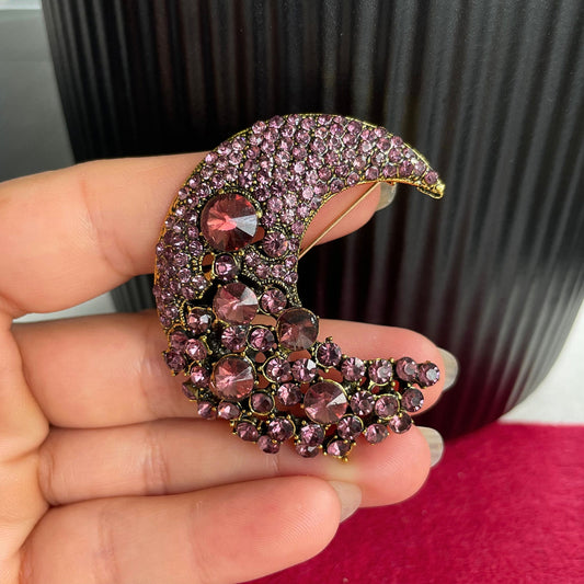 Elegant vintage style blue rhinestone crescent moon gold pin brooch