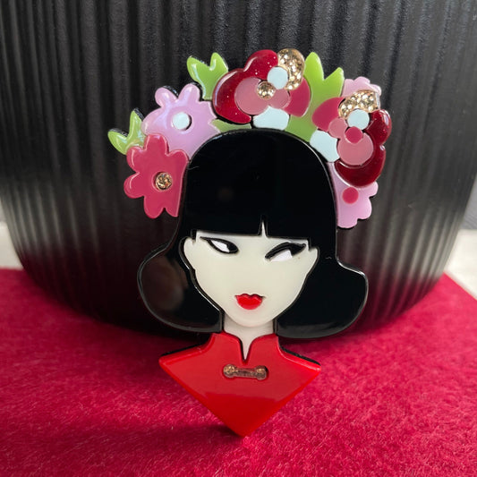 Art Deco lady with colourful flowers acrylic pin brooch