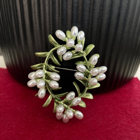 Delicate tree branch green leaf wreath flower pearls pin brooch