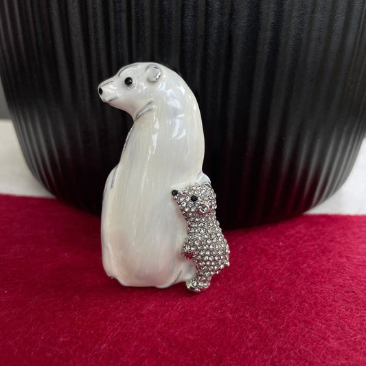 Charming mama polar bear with cub pin brooch