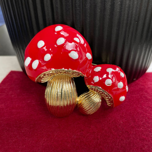 Vintage style large red enamel mushrooms gold pin brooch